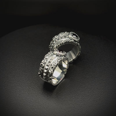 Damasco Majesty è la versione "King Size" del celebre Damasco di Manuel Bozzi. Realizzato in Argento 925 brunito e lucidato, questo anello è una generosa fascia composta da tre fedi saldate in un'unica struttura, sormontata da un castone ad 8 griffes modellate come i merli di un castello. Le decorazioni esterne sono in stile ramage mentre quella centrale è composta da borchie piramidali. Il tutto è valorizzato dalla pietra incastonata: Granato del Mozambico, Spinello Nero, Peridot, Topazio London Blue.